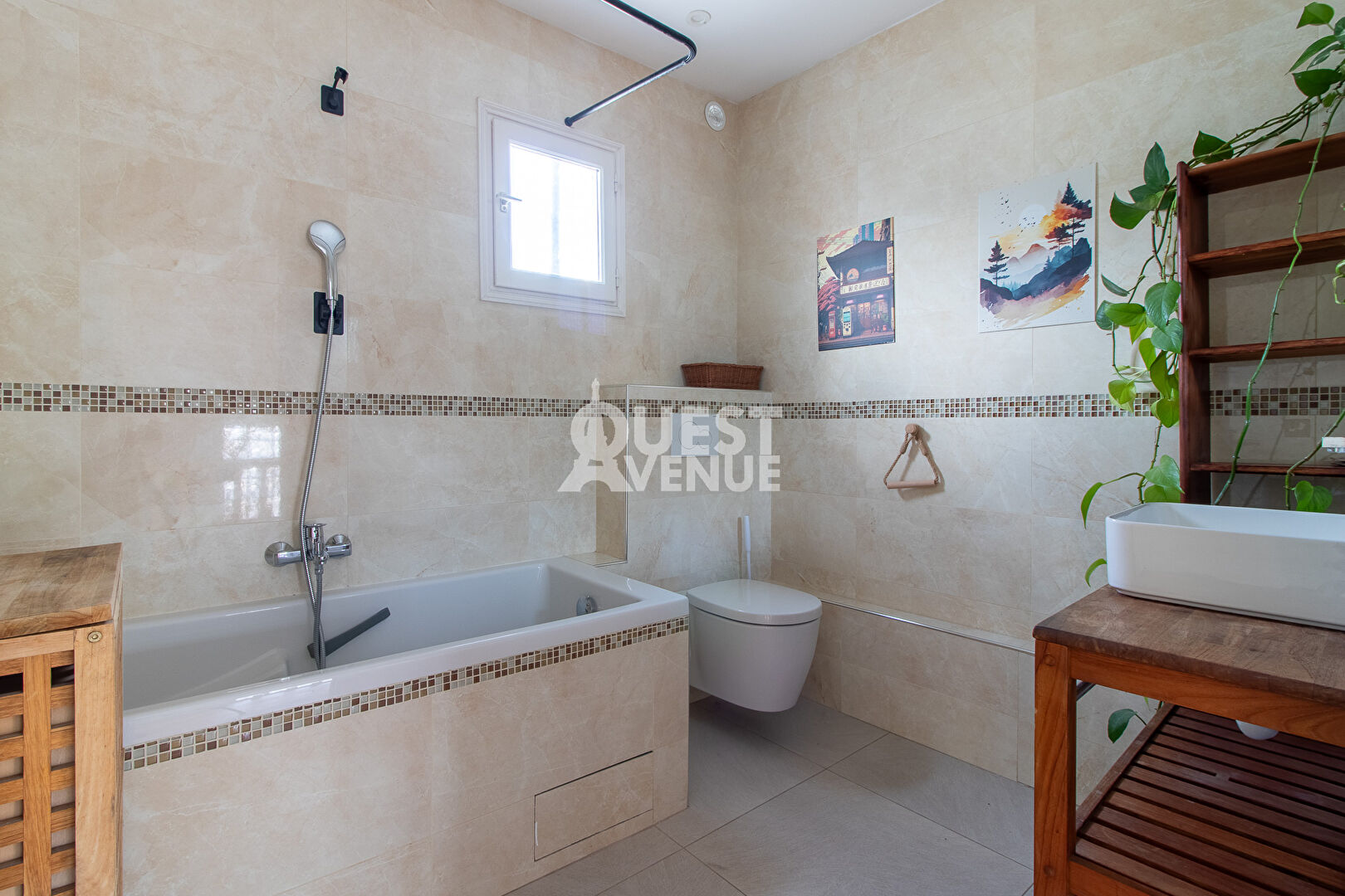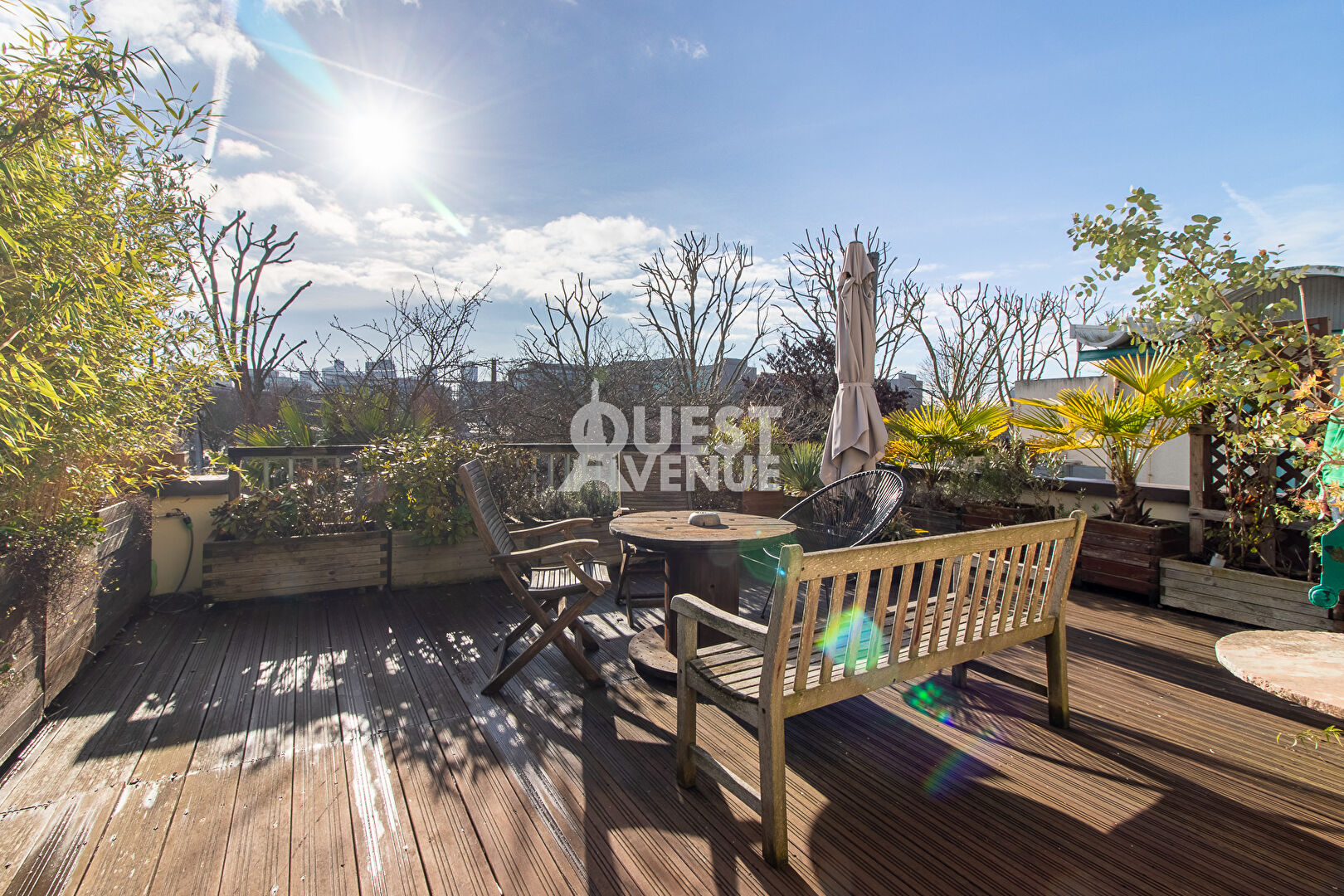 Au 1er étage : 3 grandes chambres dont 2 donnant sur une grande terrasse de plus de 34 m² sans vis-à-vis et orienté sud, salle de bains avec WC, rangements.