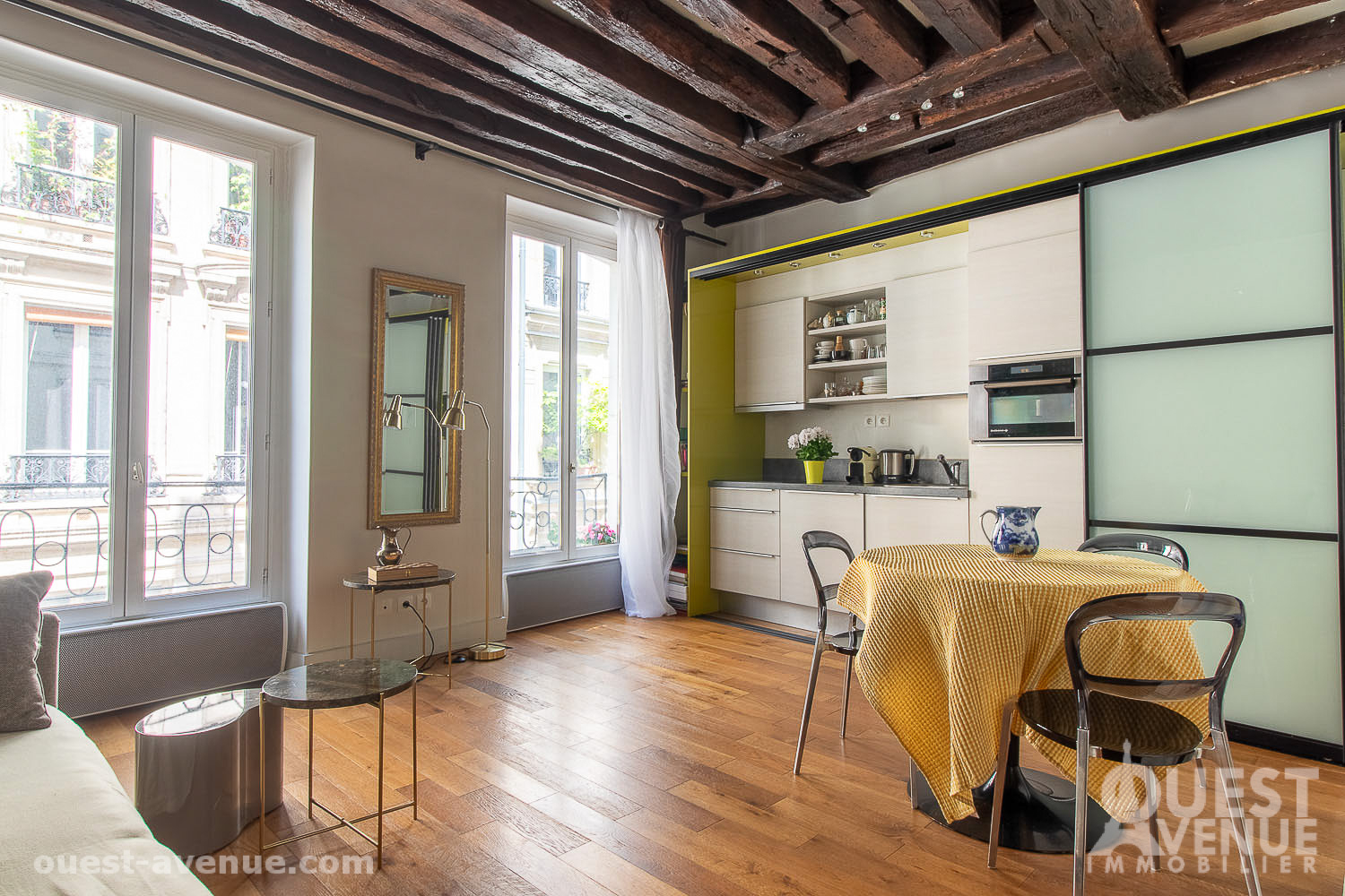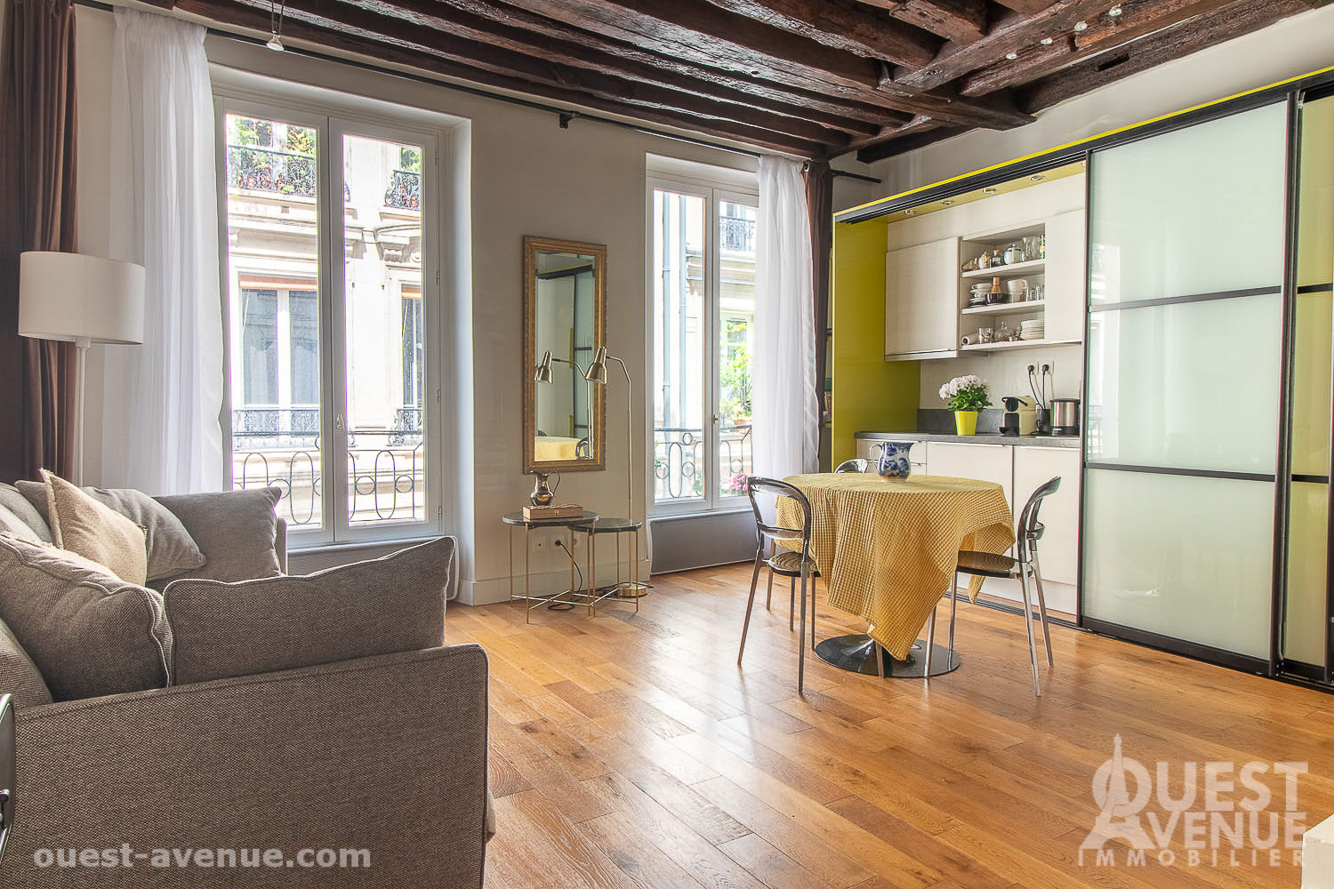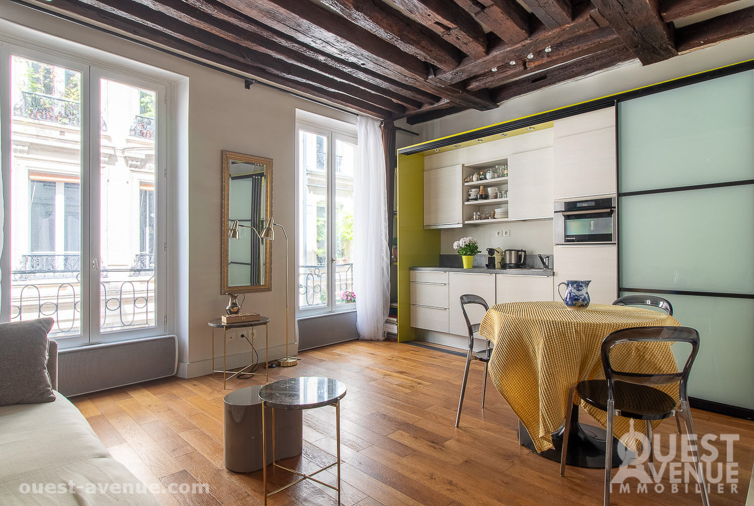 A deux pas de la rue de Bretagne, en plein coeur du Paris culturel et plein de charme, au troisième étage d’un immeuble bien tenu, ce joli deux pièces vous attend. Appartement traversant aux beaux volumes ( 3m de Hauteur sous plafond) dont le salon donne sur une rue calme quasi piétonne et la chambre sur cour. L’entrée s’ouvre sur une pièce de vie agréable et spacieuse d’une surface de 23m2 avec deux grandes fenêtres en double vitrage bois intégrant une cuisine us à portes coulissantes. A droite de l’entré, vous trouverez un wc séparé puis l’espace nuit côté cour, avec une chambre de 12m2, sa salle d’eau et quelques placards. DPE E possible avec petits ajustements du type : interrupteurs de chauffage réglables à distance, vmc premier modèle).