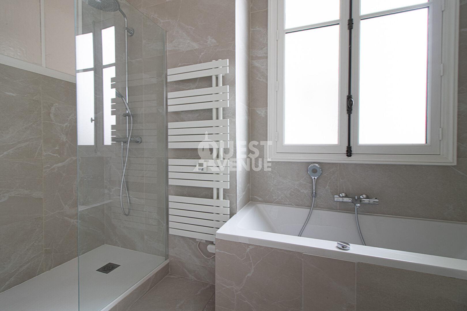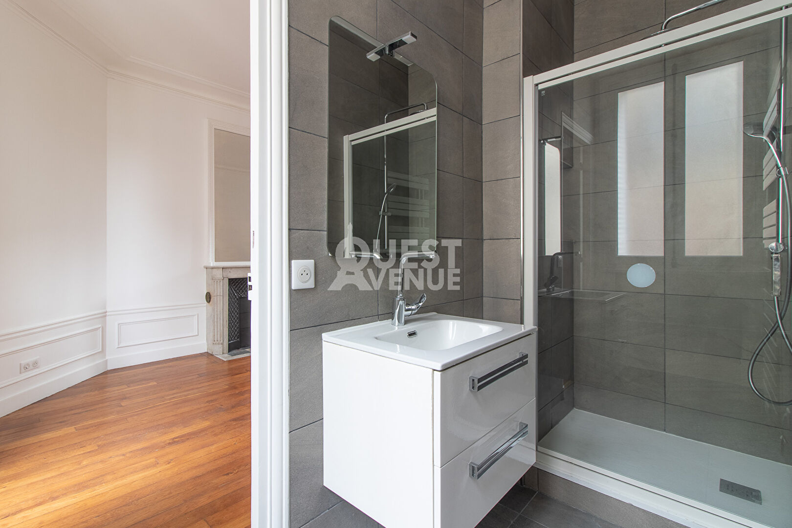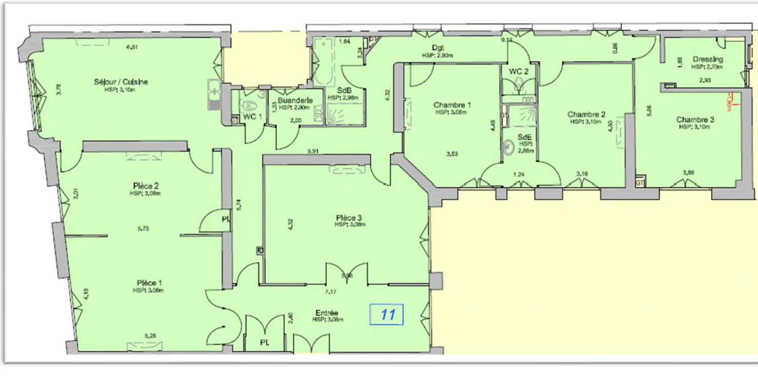 L’espace nuit comprend quatre chambres, dont une suite parentale avec dressing, toutes donnant sur une cour intérieure calme, orientée plein sud. L’appartement dispose également d’une salle de bains, d’une salle d’eau et de deux WC séparés.