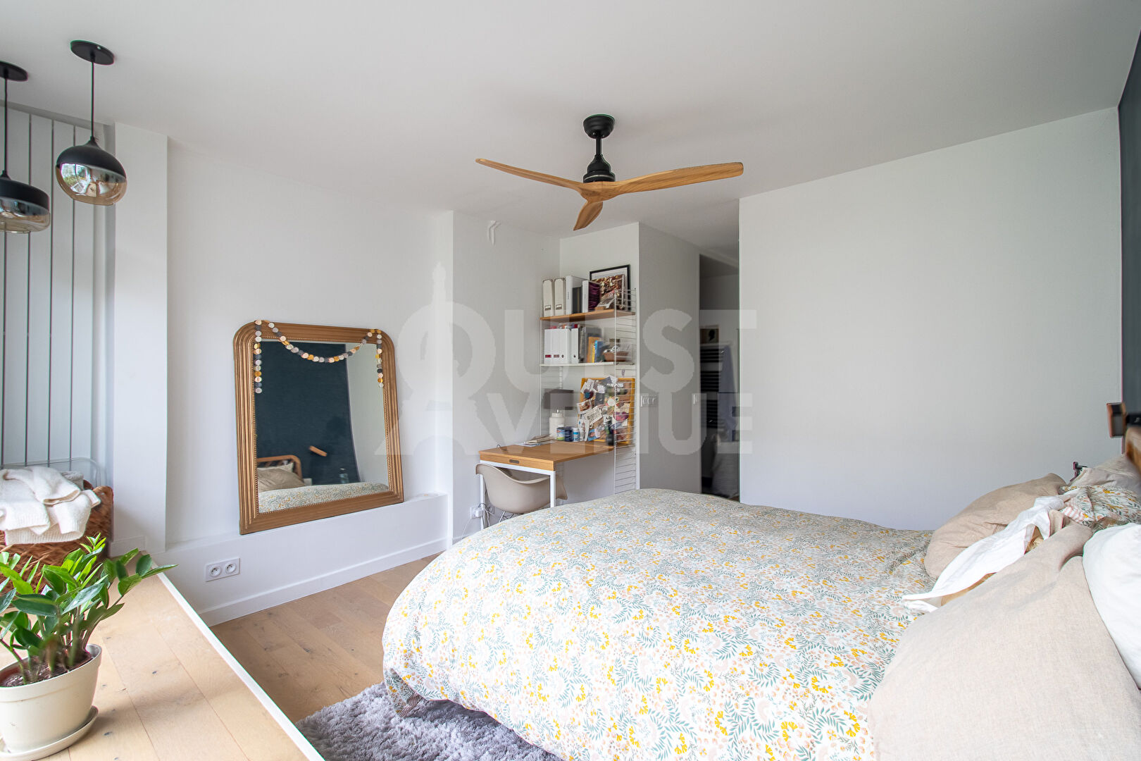 Accessible par deux petites marches, l’espace situé au rez-de-chaussée de plus de 35 m2 est composé d’une cuisine ouverte avec fenêtre côté passage puis d’un vaste espace séjour donnant sur la terrasse. De jolis et confortables escaliers en bois massifs desservent l’étage parental avec un palier avec fenêtre, une vaste chambre et sa grande baie vitrée vue ciel, une salle d’eau, un dressing et des wc sur le palier.
