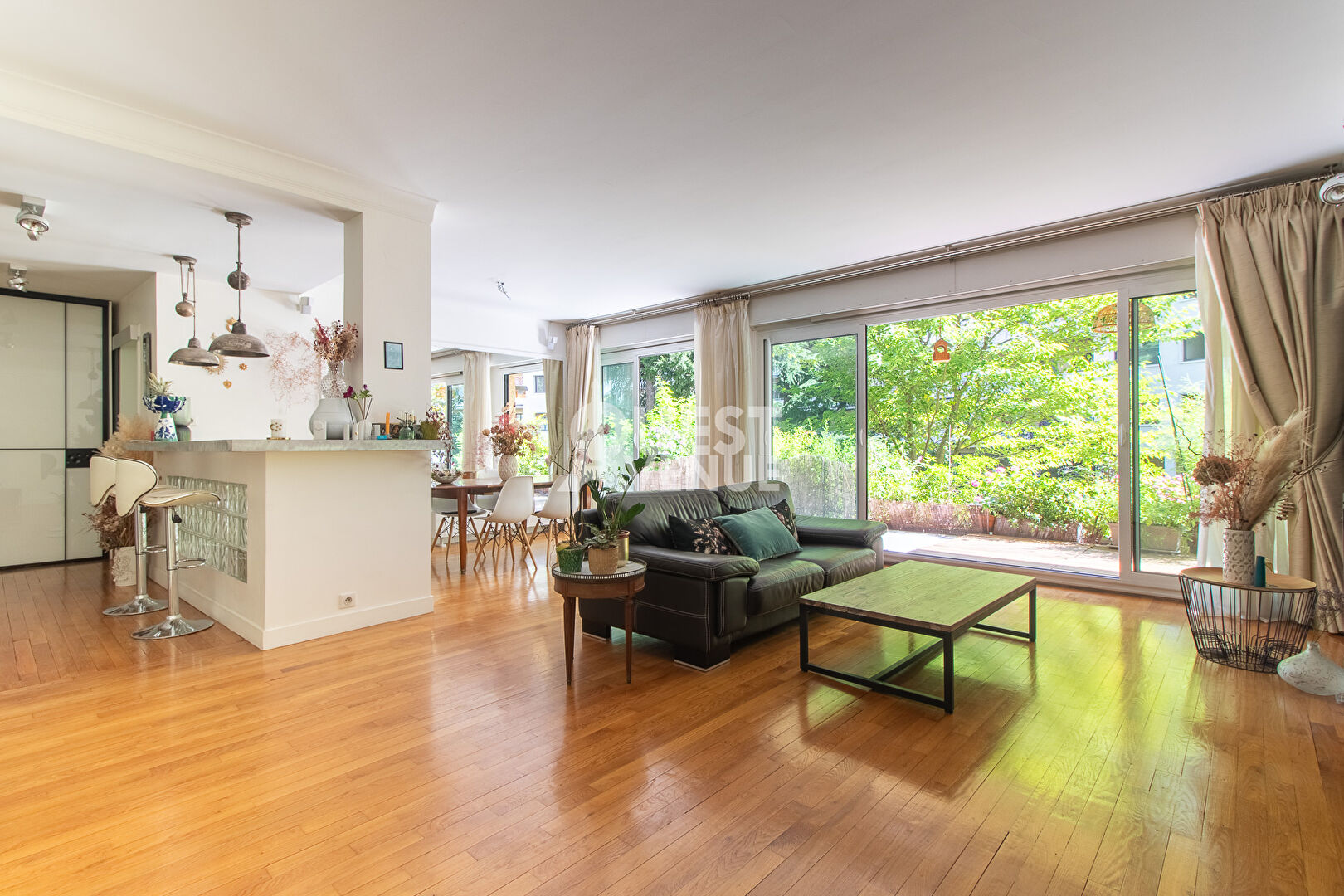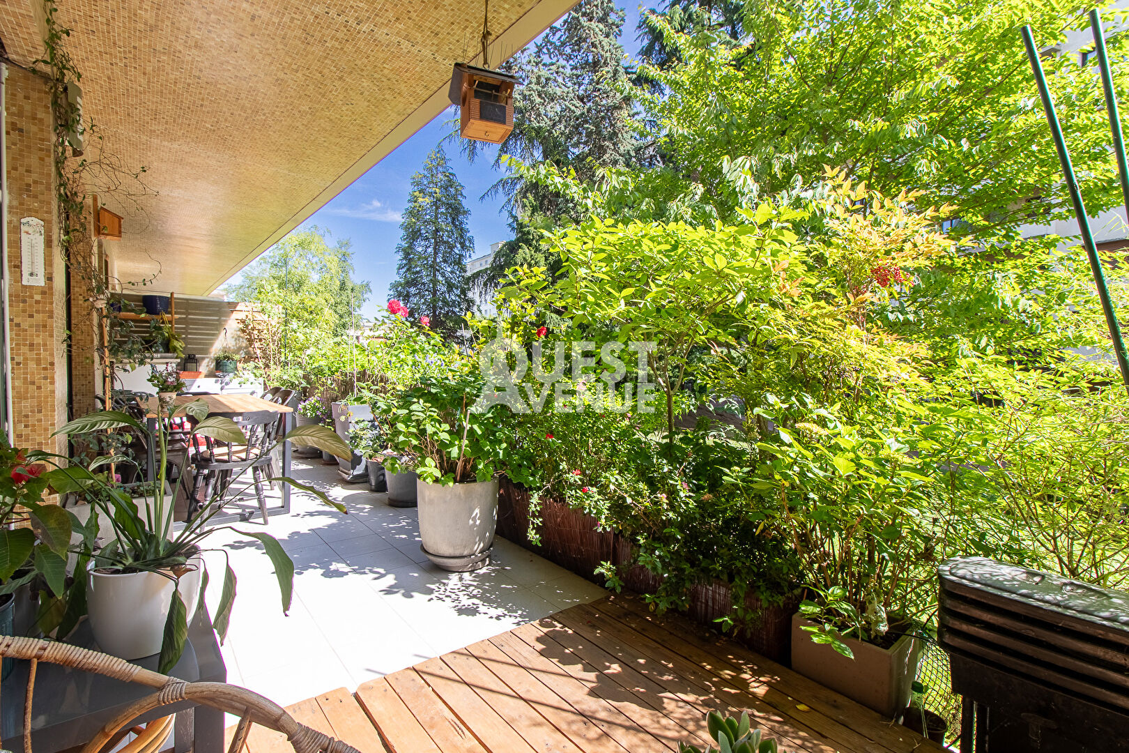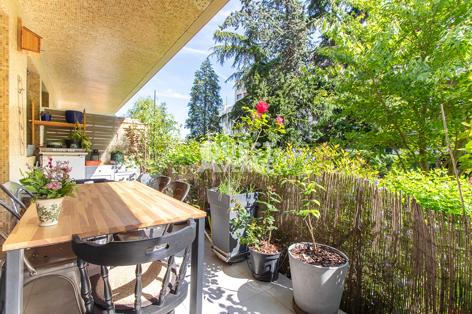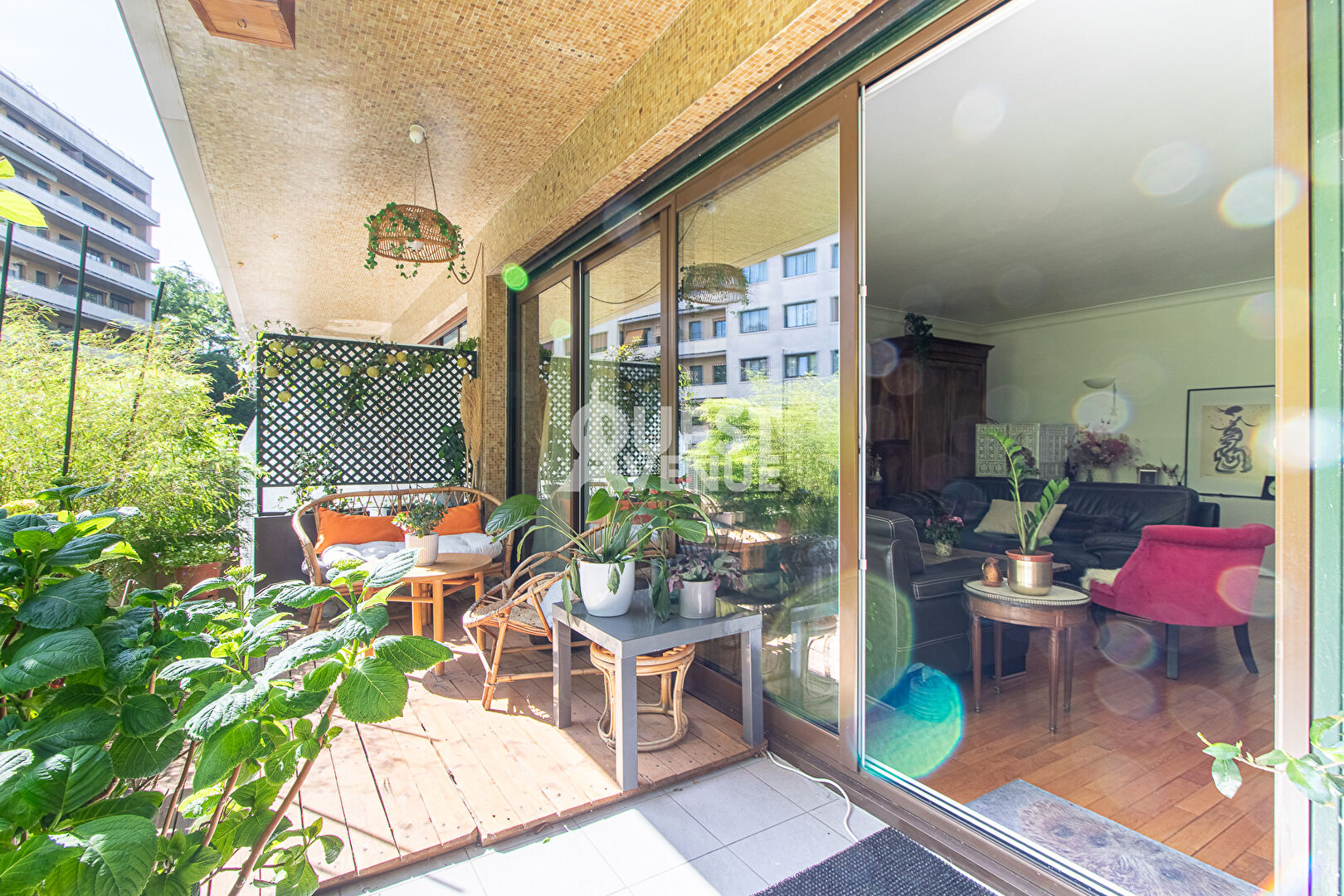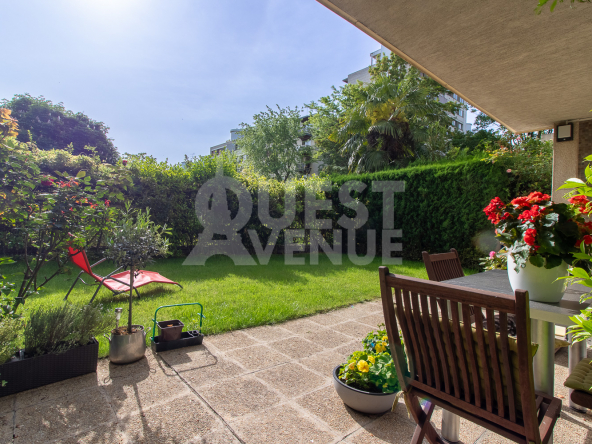 CALME. TRES BON ETAT. TERRASSE. En rez-de-jardin d’une résidence bien entretenue avec gardien et jardins, bel appartement en très bon état de 102m2 carrez + terrasse privative de 21 m2 au calme coté séjour (pondérée à 40%) et 11,5m2 coté chambre (non pondérée). Il est composé d’une très belle pièce de vie d’environ 40m2 donnant sur la grande terrasse donnant sur les jardins privatifs et sécurisés de la résidence. Les grandes baies vitrées en font un espace lumineux pour un rez de chaussée. Une cuisine aménagée et entièrement équipée, deux grandes chambres côté Ouest avec accès à la terrasse, une salle de bain, une salle de douche, un espace buanderie et d’un wc séparé. Possibilité de créer une 3ème chambre. Nombreux rangements, matériaux de qualité, volets roulants électriques centralisés, alarme. Une cave complète ce bien. Un box fermé en sous-sol est vendu en sus (25000 euro – charges environ 28/mois). Idéalement situé, à 2mn à pied de la gare du Val d’or (Ligne L), 8 minutes du tram les Coteaux (T2), commerces, écoles, centres sportifs et culturels à proximité immédiate. Profession libérale autorisée. A VOIR. Contactez votre agent commercial Virginie GROSJEAN au 06.63.89.56.56. Video également disponible sur instagram ou facebook (virginie grosjean pro). (3.02 % honoraires TTC à la charge de l’acquéreur.)