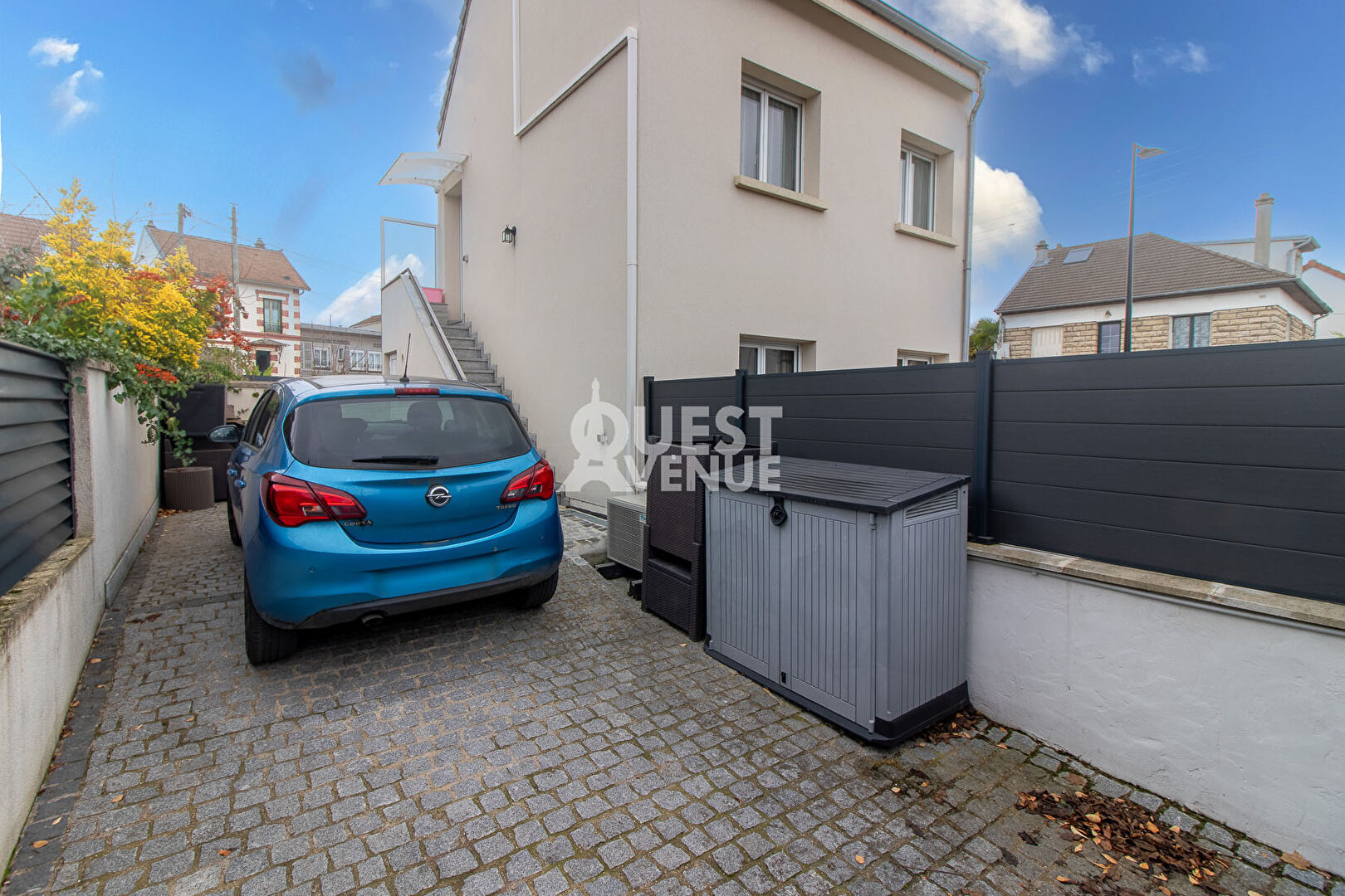 A l’extérieur, vous bénéficiez d’une cour d’environ 41 m², permettant de stationner une à deux voitures. Il est aussi possible d’y installer une table, un salon de jardin et un barbecue afin de profiter pleinement des beaux jours. Un espace de rangements complète le tout sous l’escalier d’accès à l’appartement.